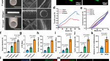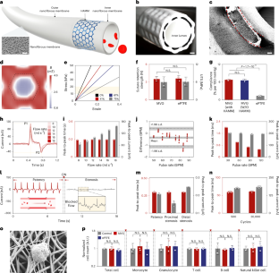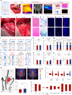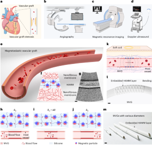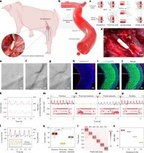 a, b, The rats with MVGs anastomosed to the femoral artery behaved and moved normally with no appreciable skin necrosis or swelling for up to 120 days post-implantation. Scale bars, 2 cm. c, The ultrasound probe is positioned above the femoral incision area to evaluate the patency of the anastomosed MVG. Partially created with BioRender. d, e, (d) The original Doppler ultrasound image alongside (e) the vascular color flow image captured the state of the anastomosed MVG two weeks post-surgery. f, g, (f) The original Doppler ultrasound image alongside (g) the vascular color flow image captured the state of the anastomosed MVG four weeks post-surgery. The use of color gradients in these images illustrates the blood flow, demonstrating the MVGβs patency during the early stages of recovery. These images provide critical insights into the graftβs immediate function and its integration within the hostβs vascular system, showcasing the preservation of blood flow and the absence of apparent major obstructions. h, The photograph depicts the femoral incision area post-implantation, showcasing wound healing with no obvious signs of wound infection or inflammation. Scale bar, 1 cm. i, An infrared thermal image of the femoral incision area reveals an even temperature distribution. This uniform thermal profile is indicative of a healthy healing process, with no obvious signs of excessive heat that could denote infection or inflammation. Scale bar, 2 cm.